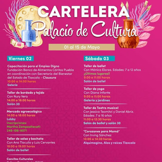 La Secretaría de Cultura dio a conocer este martes 30 de abril la cartelera oficial de actividades culturales que se desarrollarán en el estado de Tlaxcala durante los primeros quince días el mes de mayo. La agenda incluye una amplia variedad de eventos dirigidos a todos los públicos, con el objetivo de promover la participación ciudadana y fortalecer la identidad cultural de la región.